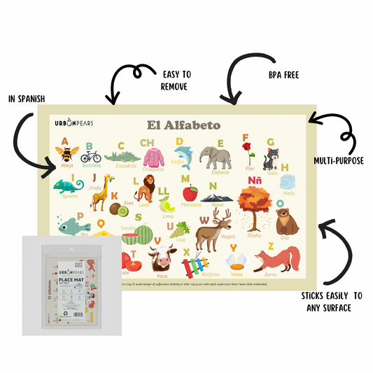 Urban Pears - Disposable Stick-on Placemats -40 pack for Baby & Kids at Home, Restaurant and School - 12'' x 18'', Spanish Alphabet Theme
